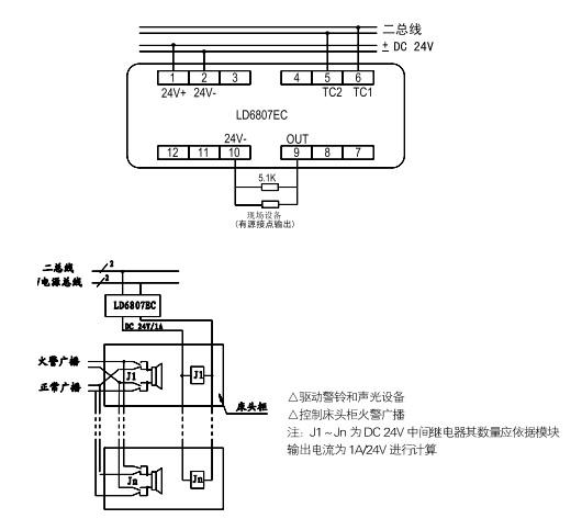 LD6807EC聲光(廣播)報警驅動模塊采用單片計算機和智能軟件,工作穩定、可靠。有較強的抗干擾能力。主要用于聲光報警器、警鈴、閃燈和消防廣播切換床頭柜等設備的控制??梢耘c利達公司生產的LD128E系列火災報警控制器配合使用。