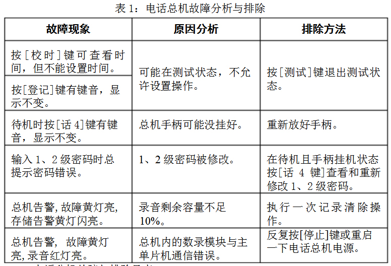 1 電話總機故障與排除見表1: